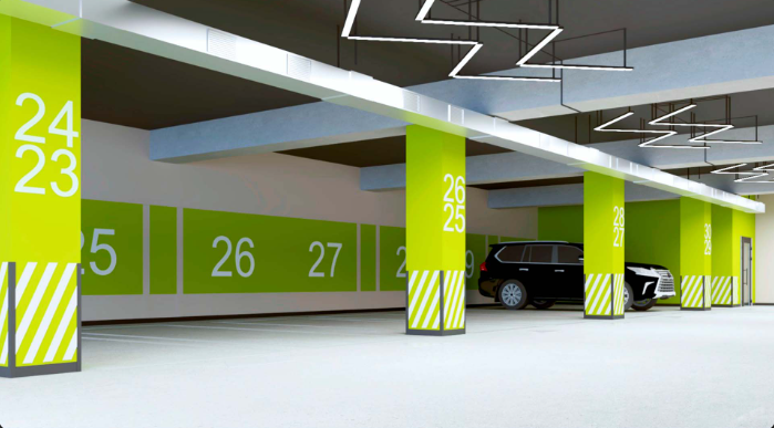 Проектом предусмотрен подземный трехуровневый паркинг c зарядной станцией для электромобилей, а также наземные парковочные места по периметру жилого квартала. Коэффициент парковочных мест соответствует количеству квартир.
