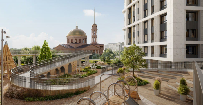 Визитная карточка проекта - парящий многоуровневый мост, протяженностью 239 м, а также удобные игровые площадки, зоны для уединения на свежем воздухе, оригинальные арт - объекты на территории комплекса